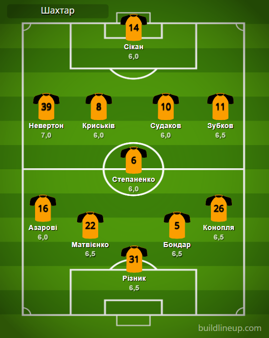 «Шахтар»: Різник – Азаров (Ракіцький, 34), Матвієнко, Бондар, Конопля – Степаненко – Невертон (Гочолеішвілі, 72), Криськів, Судаков, Зубков (Назарина, 76) – Сікан (Келсі, 90+3).