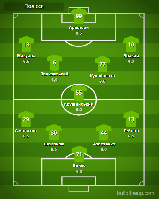 «Полісся»: Бойко – Смоляков, Шабанов, Чоботенко, Тейлор – Танковський, Крушинський (Огіря, 75), Кушніренко – Макуана, Аріелсон (Шастал, 83), Янаков (Козак, 46).
