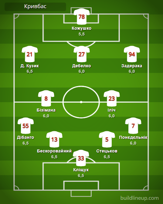 «Кривбас»: Кліщук – Дібанго, Стецьков, Бескоровайний, Понєдєльнік – Іліч (Татарков, 62, Прінс, 82), Бізімана – Д. Кузик (Блізніченко, 81), Дебелко (Приходько, 61), Задерака – Кожушко (Устименко, 90+1).