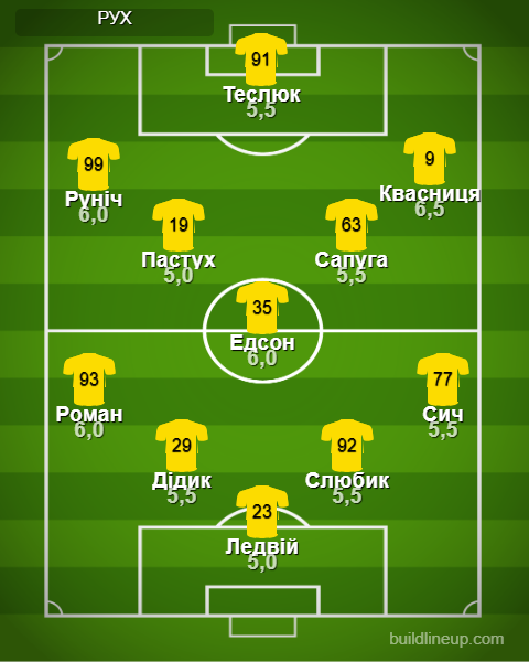 «Рух»: Ледвій - Сич, Слюбик, Дідик, Роман - Пастух (Карабін, 80), Сапуга, Едсон (Плюман, 63) - Квасниця, Теслюк (Соломон, 63), Руніч (Таллес, 51).