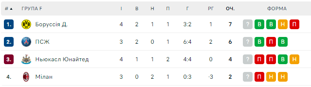 Боруссія Д набрала 7 очок і очолює групу F. Далі йдуть ПСЖ (6), Ньюкасл (4) та Мілан (2).