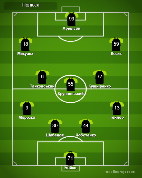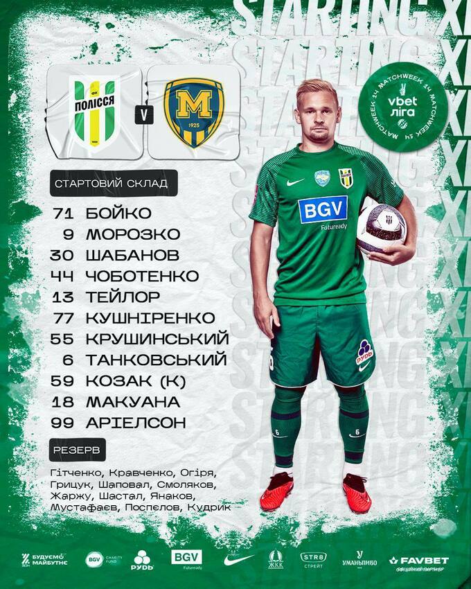 «Полісся»: Бойко, Шабанов, Чоботенко, Морозко (Смоляков, 24), Тейлор, Крушинський (Мустафаєв, 46), Танковський, Кушніренко (Грицук, 63), Макуана, Козак, Аріелсон (Шастал, 46).