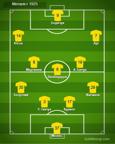 «Металіст 1925»: Мозіль, Жичиков (Капінус, 46), Курило, Є. Ткачук, Безуглий, Вачіберадзе (Габелок, 45+6), Арі Моура (Дмитренко, 63), А. Ткачук (Бичек, 77), Мартинюк, Юсов, Борячук (Сидоров, 63).