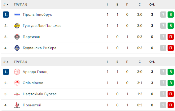 У першому турі «Прометей» поступився румунському клубу «Аркада» Галац (0:3), а «Олімпіакос» переграв болгарський «Нафтохімік» Бургас (3:1).