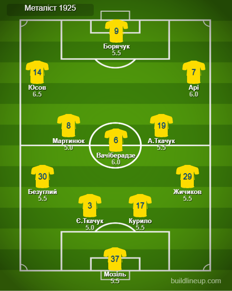 «Металіст 1925»: Мозіль, Жичиков (Капінус, 46), Курило, Є. Ткачук, Безуглий, Вачіберадзе (Габелок, 45+6), Арі Моура (Дмитренко, 63), А. Ткачук (Бичек, 77), Мартинюк, Юсов, Борячук (Сидоров, 63).