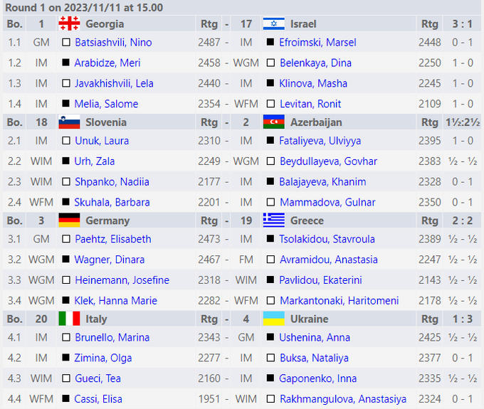 У першому турі українки переконливо обіграли команду Італії (3:1). Перемоги здобули Букса (на 2-й дошці) та Рахмангулова (на 4-й). Унічию свої партії завершили Ушеніна та Гапоненко.