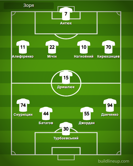 «Зоря»: Турбаєвський – Снурніцин, Батагов, Джордан, Данченко (Горбач, 46) – Дришлюк (Жан Клод, 67) – Алефіренко, Мічін (Волошин, 56, Чурко, 79), Нагнойний (Мишньов, 56), Кирюханцев – Антюх.