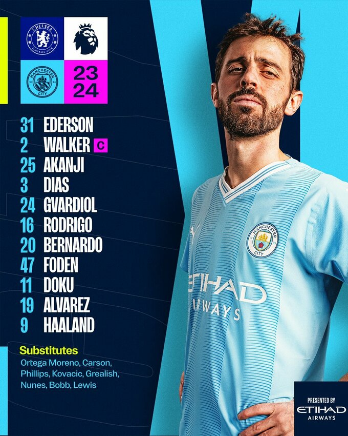 «Манчестер Сіті»: Едерсон – Гвардіол, Діаш, Аканджі, Вокер – Бернарду, Родрі – Доку (Гріліш, 60), Альварес (Ковачич, 79), Фоден – Голанд.