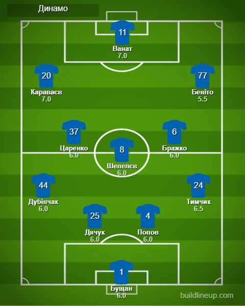 «Динамо»: Бущан, Попов, Бражко, Шепелєв (Андрієвський, 80), Ванат (Супряга, 88), Караваєв (Малиш, 90+1), Тимчик, Дячук, Царенко (Буяльський, 80), Дубінчак, Беніто (Кабаєв, 46).
