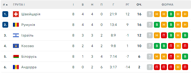 Швидше за все, із групи I на Євро-2024 вийдуть Швейцарія та Румунія (по 16 очок).