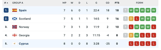 Група А. Іспанія впевнено перемогла Кіпр, Грузія поділила очки з Шотландією