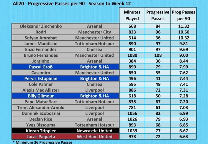 За загальною кількістю пасів із просуванням лідером нинішнього сезону в АПЛ є півзахисник «Манчестер Юнайтед» Бруну Фернандеш. На його рахунку 108 таких передач, але за середнім показником він програє Зінченку.