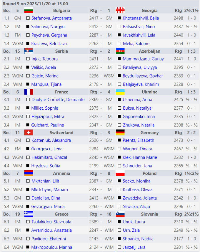 У останньому 9-му турі українки (4-та команда турніру за рейтингом) обіграли команду Франції (3:1). Свої партії виграли Букса (на 2-й дошці) та Гапоненко (на 3-й). Внічию завершилися партії Ушеніної (на 1-й дошці) та Жукової (на 4-й).