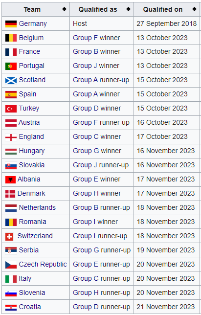 - Німеччина (господар), Бельгія, Франція, Португалія, Іспанія, Шотландія, Туреччина, Австрія, Англія, Угорщина, Словаччина, Албанія, Данія, Нідерланди, Румунія, Швейцарія, Сербія, Чехія, Італія, Словенія, Хорватія.