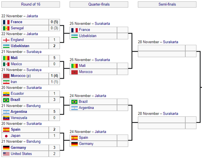 У чвертьфіналах зіграють: Франція – Узбекистан, Малі – Марокко, Бразилія – Аргентина, Іспанія – Німеччина.