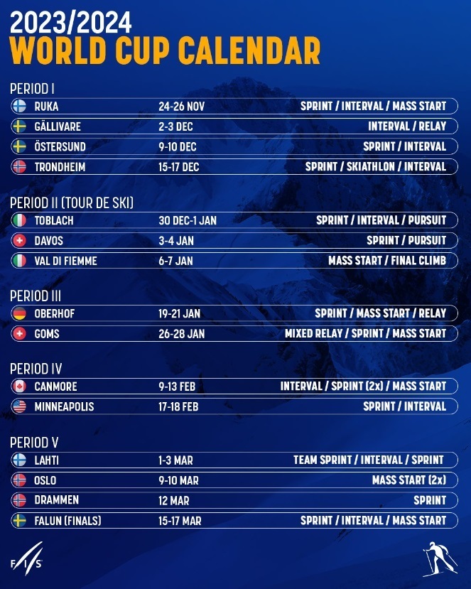 Завершувати сезон будуть традиційні етапи в Лахті, Осло, Драммені та Фалуні. Сумарно – по 33 особисті гонки у чоловіків і жінок, по три класичні естафети і по одній змішаній. Із 33 особистих гонок буде 13 спринтів (6 – класикою, 7 – коньком) і 20 дистанційних гонок.