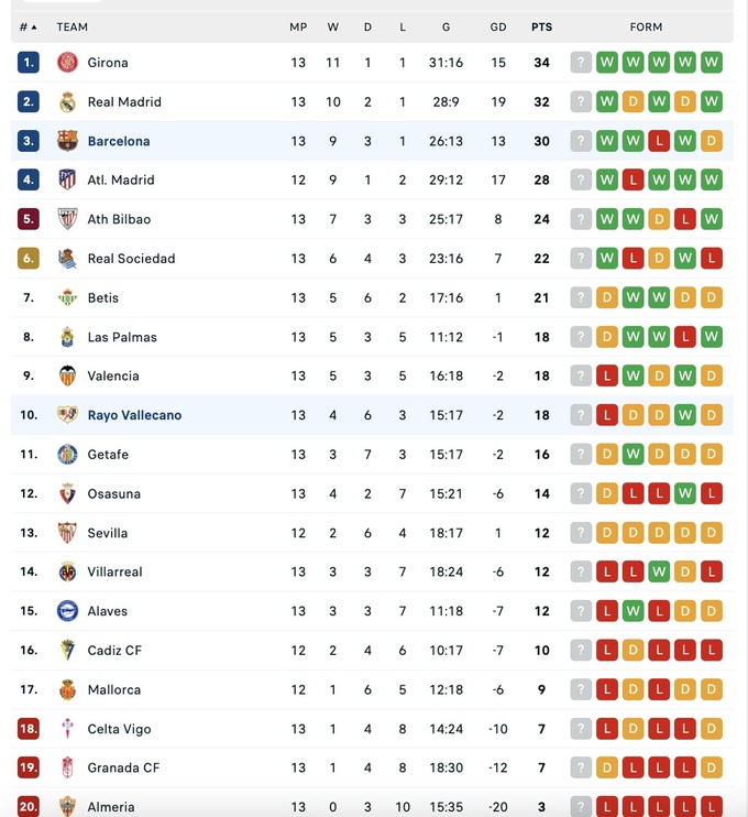 Після 13 зіграних турів в чемпіонаті Іспанії з футболу «каталонці» посідають третю сходинку з 30 очками, а «Райо Вальєкано» йде десятим з 18 балами.
