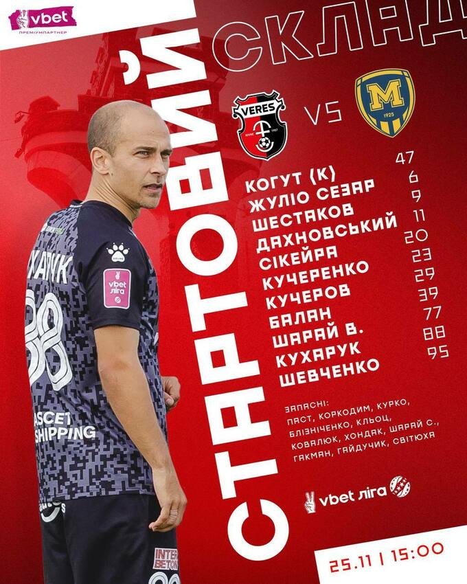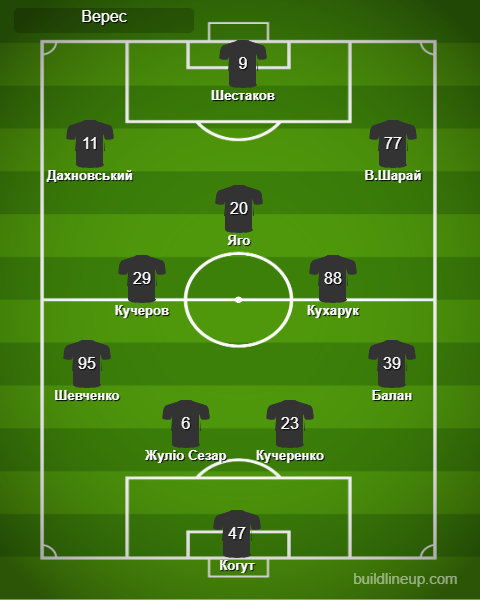 "Верес": Когут, Жуліо Сезар, Шестаков (Курко, 90+4), Дахновський (Гайдучик, 86), Яго (Блізніченко, 80), Кучеренко, Кучеров, Балан, Шарай В., Кухарук (Кльоц, 46), Шевченко.