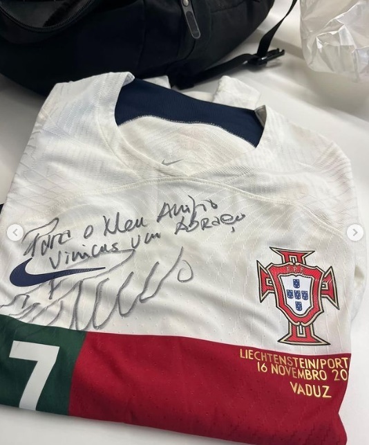 На формі нападник «Аль-Насра» залишив автограф і написав: «Моєму другу Вінісіусу. Обіймаю».