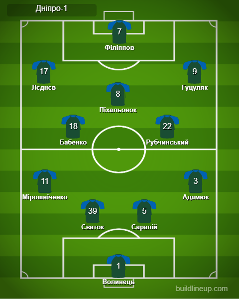 «Дніпро-1»: Волинець, Адамюк, Сарапій, Сваток, Мірошніченко, Бабенко (Маркос Андре, 90), Рубчинський, Піхальонок (Вітіньо, 78), Лєднєв (Кравець, 82), Гуцуляк (Горбунов, 90), Філіппов (Танчик, 46).