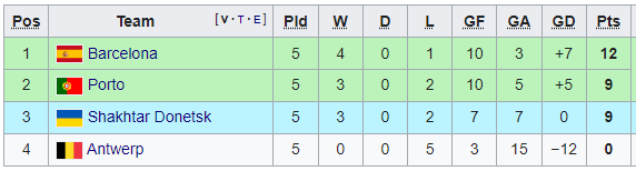 Турнірне становище після 5-го туру: Барселона (12 очок), Порту (9), Шахтар (9), Антверпен (0).