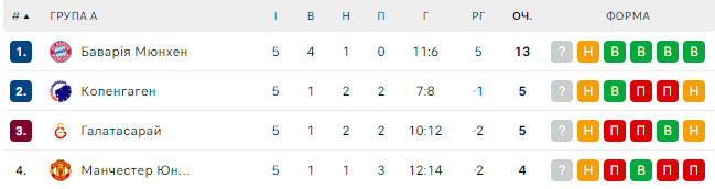 Турнірне становище: Баварія (13), Копенгаген (5), Галатасарай (5), Манчестер Юнайтед (4).