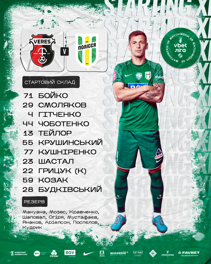 «Полісся»: Бойко – Смоляков, Гітченко, Чоботенко, Тейлор – Кушніренко, Крушинський (Огіря, 86) – Шастал (Макуана, 46), Грицук, Козак – Будківський.
