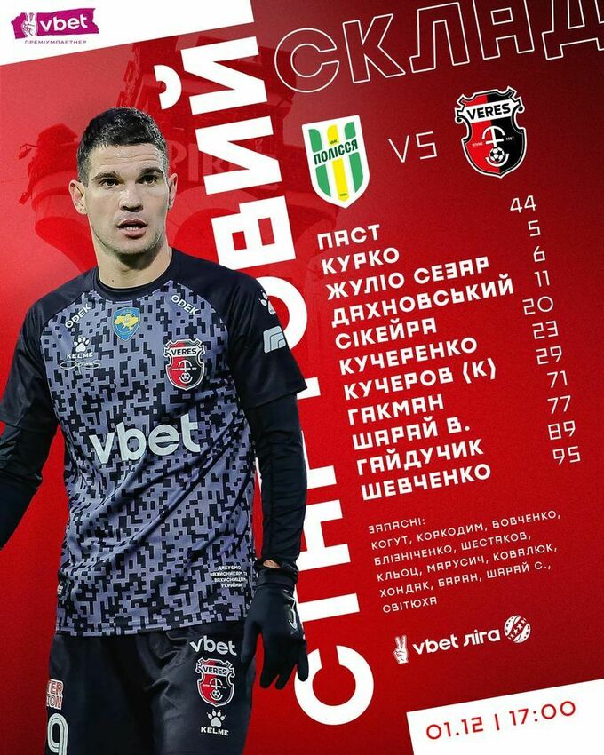 «Верес»: Паст – Шевченко, Жуліо Сезар, Кучеренко, Курко – Кучеров (Марусич, 88), Гакман – В. Шарай, Яго (Блізніченко, 85), Дахновський (Шестаков, 71) – Гайдучик.