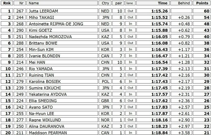 Нідерландка потрапила в останню пару і змогла покращити час попереднього лідера Міхо Такагі на 0.26 секунди. Японка зрештою стала другою, а третє місце посіла ще одна спортсменка з Нідерландів Антуанетта Райпма-Де Йонг.