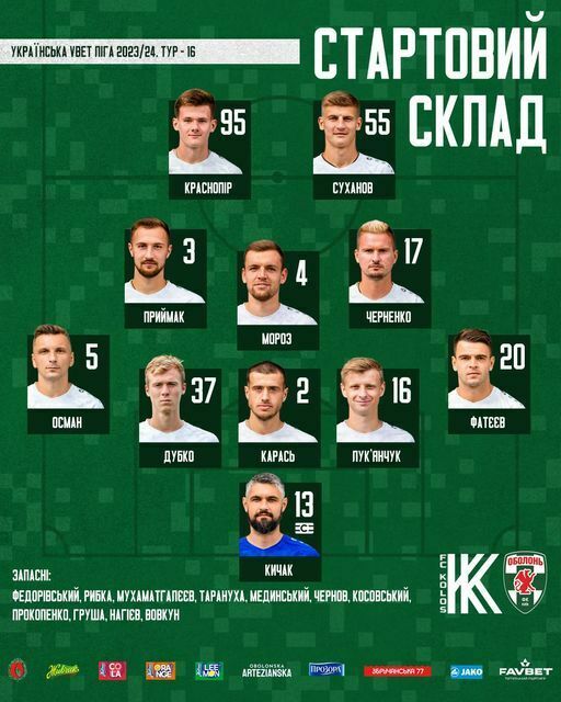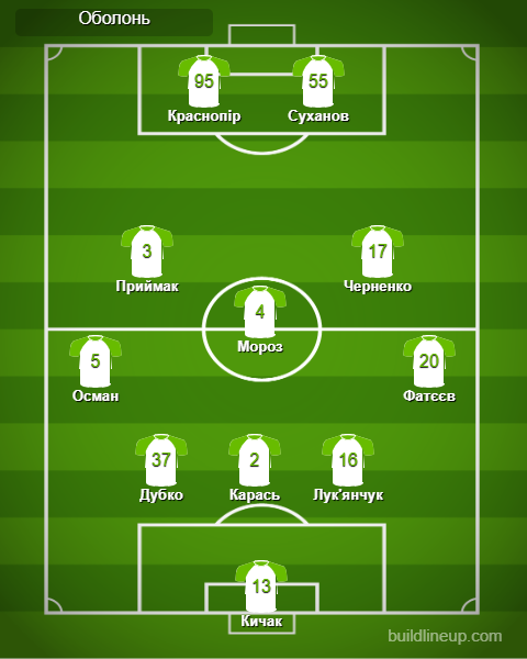 «Оболонь»: Кичак, Осман, Дубко, Карась, Лук'янчук, Фатєєв, Черненко, Приймак, Мороз, Краснопір, Суханов (Тарануха, 65).