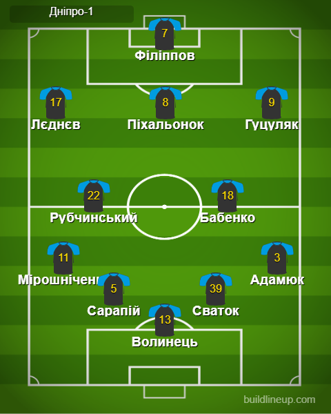 «Дніпро-1»: Волинець - Адамюк (Пасіч, 61), Сваток, Сарапій, Мірошниченко - Бабенко, Рубчинський - Гуцуляк, Піхальонок, Лєднєв (Вітіньо, 73) - Філіппов (Танчик, 61).