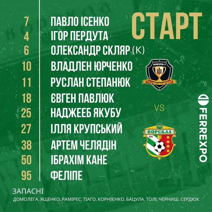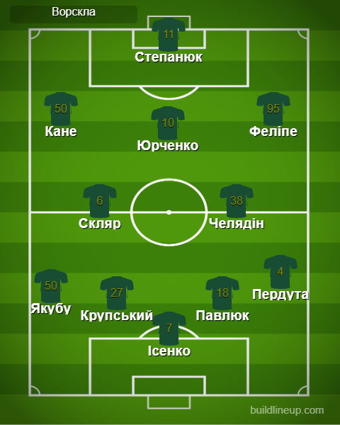 «Ворскла»: Ісенко - Пердута, Павлюк, Крупський, Якубу (Бацула, 90+4) - Скляр, Челядін (Сантана, 90+4) - Феліпе, Юрченко (Корнієнко, 74), Кане - Степанюк.