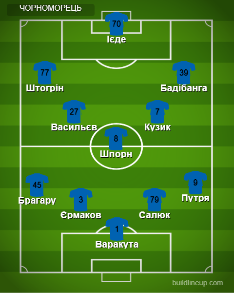 «Чорноморець»: Варакута - Путря,Салюк, Єрмаков, Брагару - Кузик, Васильєв (Хадіда, 90) - Бадібанга, Шпорн, Штогрін - Ієде (Бойчук, 72).