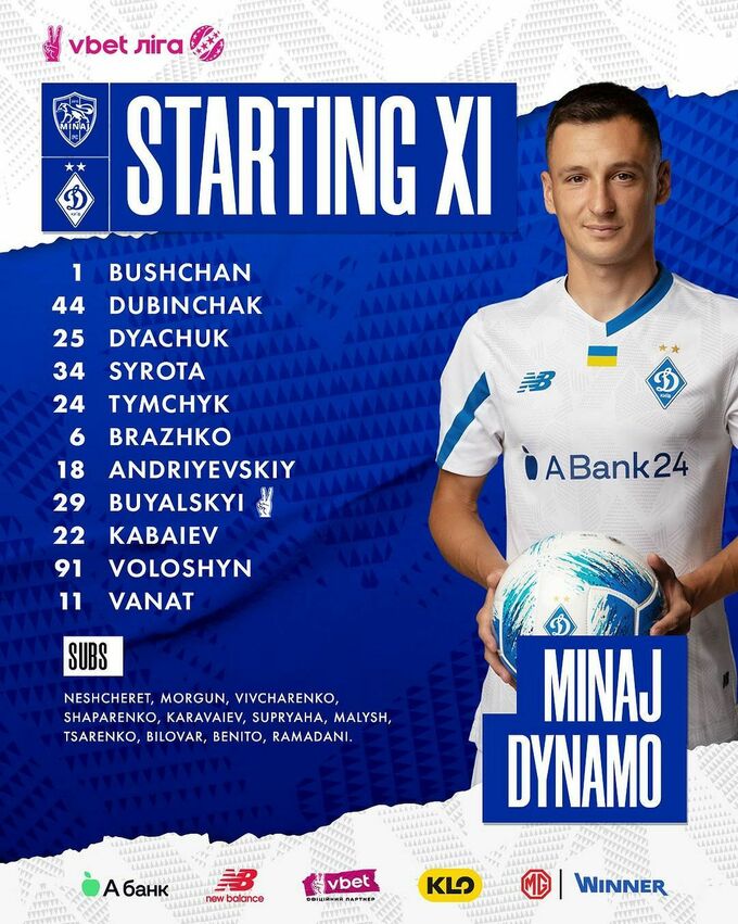 «Динамо» Київ: Бущан, Дубінчак, Дячук, Сирота, Тимчик, Андрієвський, Бражко, Кабаєв, Буяльський, Волошин, Ванат
