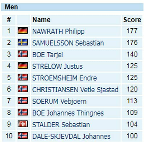 У загальному заліку після першого етап лідерство захопив сенсаційний Наврат. Самуельссон другий із відставанням всього в одне очко. І вже на відстані більше 35 очок купа норвежців на чолі з Бьо-старшим. У топ-10 їх аж шестеро.
