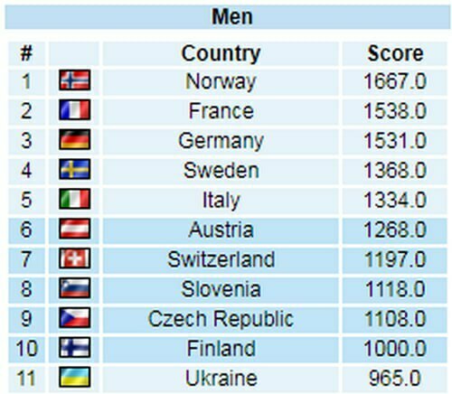 Зрозуміло, що у Кубку націй теж попереду Норвегія, причому з величезним, як для одного етапу, відривом. За ними йдуть Франція та Німеччина.