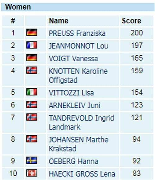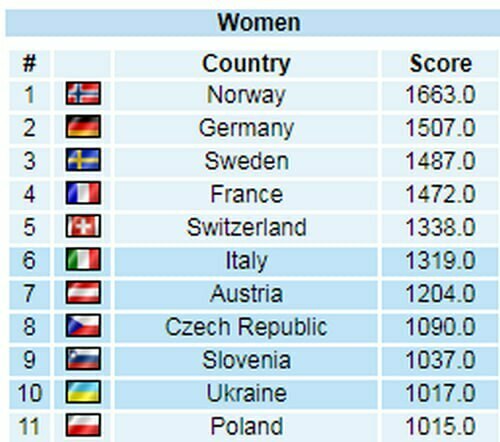 У кубку націй норвежки мають аж 156 очок переваги над збірною Німеччини. Третіми йдуть шведки.
