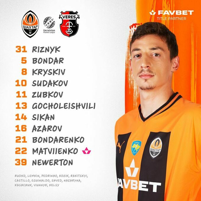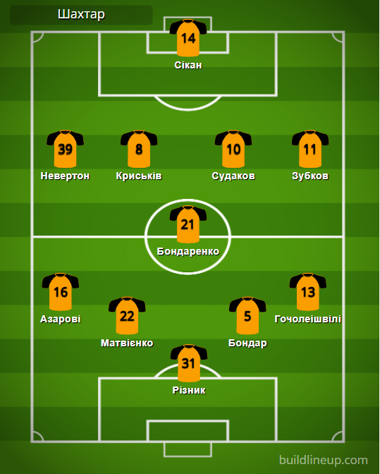 «Шахтар»: Різник – Азарові, Матвієнко, Бондар, Гочолеішвілі – Бондаренко – Невертон (Егіналду, 61), Криськів (Назарина, 64), Судаков, Зубков (Кащук, 89) – Сікан (Келсі, 61).