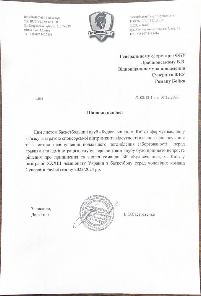 Столичний «Будівельник» повідомив Федерації баскетболу України про припинення участі в чемпіонаті України.