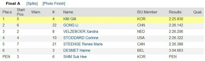 У фінальному забігу Кім єдина вибігла з 2 хвилин і 26 секунд, випередила другу місцеву шорт-трекістку Гун Лі на 0.332 секунди та здобула третю в нинішньому сезоні перемогу на Кубку світу. Третьою стала нідерландка Ксандра Фелзебур.