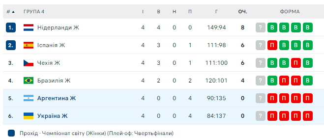 В групі, крім аргентинок та українок, є ще команди Нідерландів, Іспанії, Чехії та Бразилії. З групи в чвертьфінал виходять дві кращих команди, в їх число вже не потрапить Україна, оскільки має нуль в графі набраних очок після чотирьох матчів. В останній на даний момент грі «синьо-жовті» поступилися Нідерландам з рахунком 21:40.