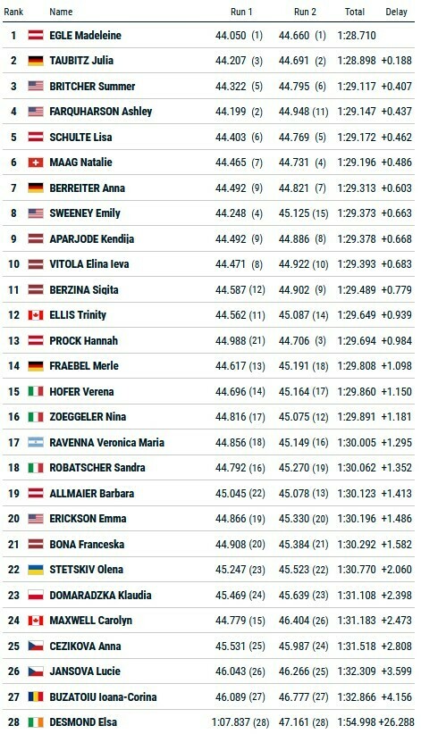 Егле показала найкращий час в обох спусках, проте перший проїхала трохи швидше. Другою стала німецька спортсменка Юлія Таубітц, а третє місце посіла Саммер Брітчер. Американка показала п'ятий час у першому спуску та шостий – у другому. Але її співвітчизниця Ешлі Фаркухарсон, яка після першого спуску була другою з непоганими шансами на перемогу, невдало виконала другий та відкотилася на четверту позицію. А австрійська саночниця Ханна Прок, яка стала третьою у другому спуску, після першого була лише 21-ю та у підсумку посіла лише 13-те місце.