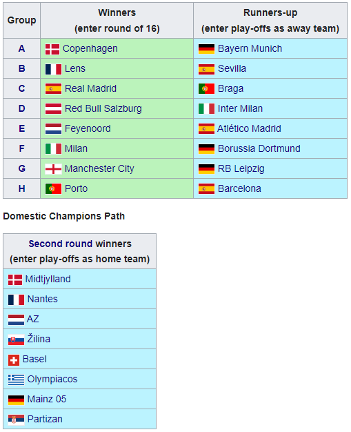 - Перші місця груп: Копенгаген, Ланс, Реал Мадрид, Ред Булл Зальцбург, Фейєнорд, Мілан, Манчестер Сіті, Порту