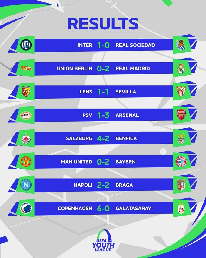 - Манчестер Юнайтед U19 – Баварія U19 – 0:2