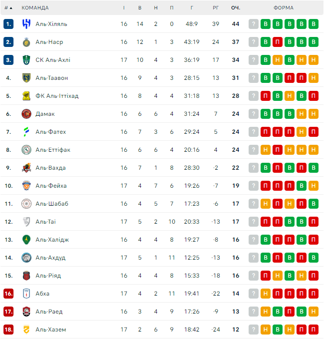 Лідери чемпіонату: Аль-Хіляль (44), Аль-Наср (37), Аль-Ахлі (34), Аль-Таавун (31), Аль-Іттіхад (28).