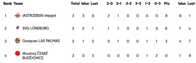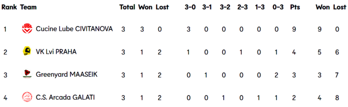 Цікаво, що в кожній із 5 груп є одноосібний лідер, який здобув по три перемоги. Але, якщо у групах В, D та Е італійський «Трентіно», польський «Ястшембски Вегель» та ще один клуб з Італії «Кучіне Лубе» набрали максимальну кількість очок (по 9), то у групах А та С турецькі «Зіраат Банкаси» та «Халбанк» мають по 8 очок, тобто по одному матчу вони завершили поєдинки з рахунком 3:2 на свою користь.