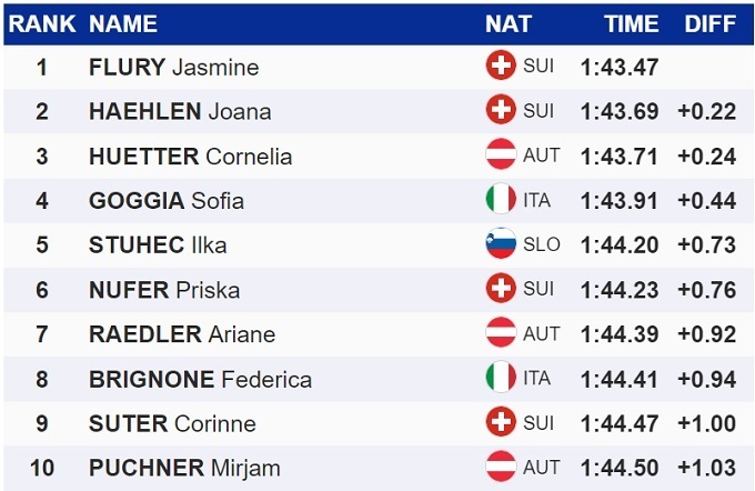 Швейцарська гірськолижниця Ясмін Флюрі виграла швидкісний спуск на етапі Кубка світу у французькому Валь д'Ізер. Чемпіонка світу випередила свою партнерку по команді Йоану Хелен і австрійку Корнелію Хюттер.