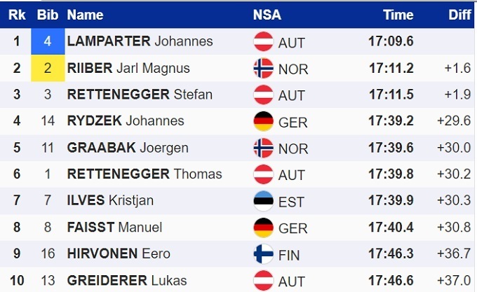 Як і вчора, другим став лідер загального заліку Кубка світу, норвежець Ярл Магнус Ріібер. Топ-3 замкнув ще один австрієць, Штефан Реттенеггер.