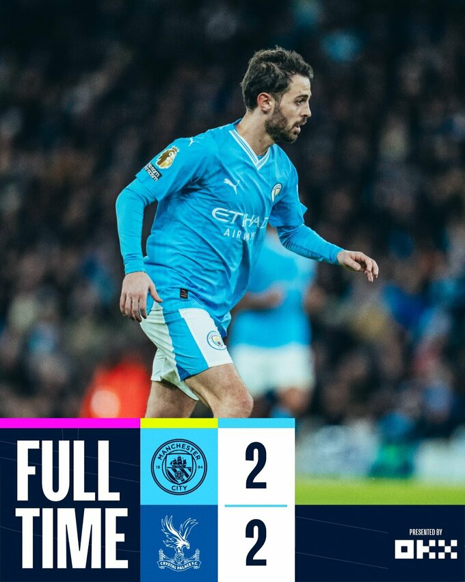 Чинний чемпіон АПЛ «Ман Сіті» на домашньому полі не втримав перевагу у два м'ячі у матчі з «Крістал Пелас» та зіграв внічию 2:2, Олісе реалізував пенальті на 90+5 хвилині.