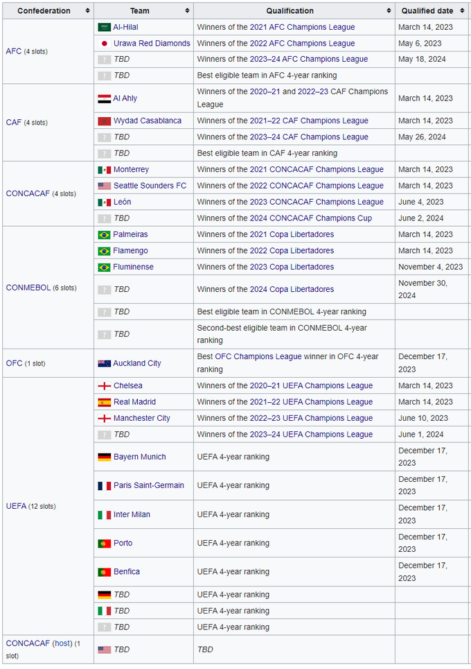 Ці 12 місць будуть розподілені так: переможці Ліги чемпіонів у період з 2021 по 2024 рік (Челсі, Реал, Ман Сіті та переможець поточного сезону ЛЧ) плюс 8 команд на основі клубного рейтингу за 4-річний період.